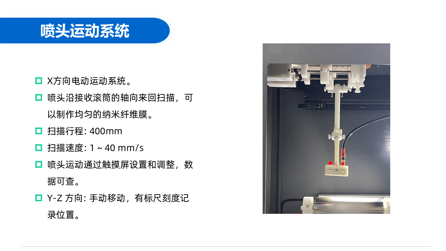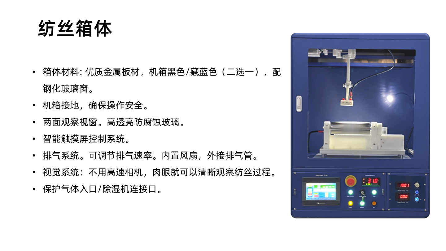 這款設備采用先進的觸摸屏控制系統和多點接地的安全系統,能夠安全可靠地操作。它適用于不同類型的溶劑體系,包括水性和有機溶劑,是制備納米纖維膜的最佳入門選擇。