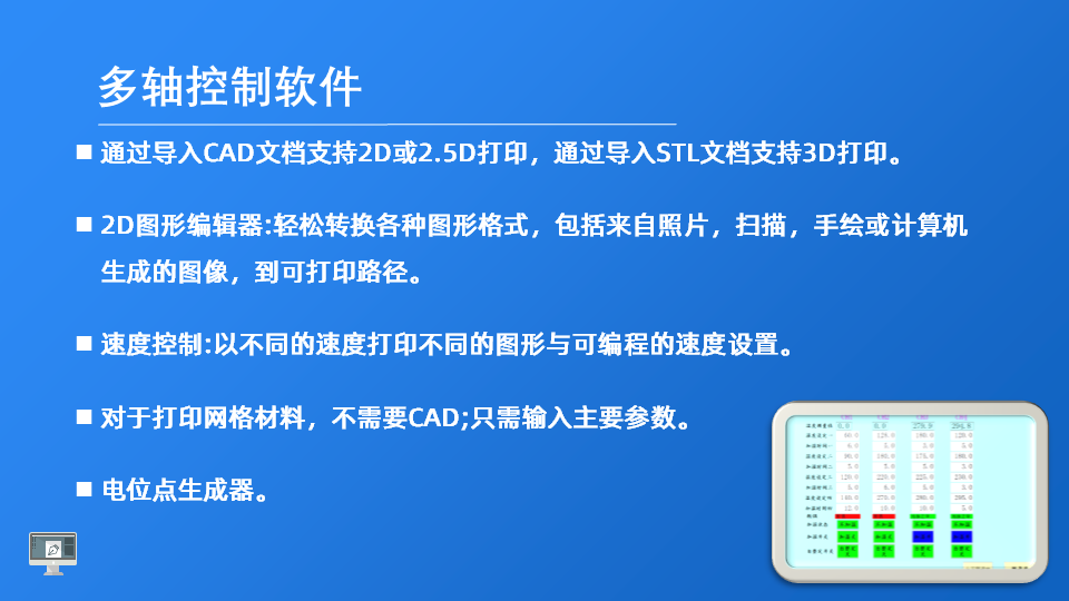 | 軟件: (1)控制系統和軟件,2D或者2.5D打印可導入CAD文檔,3D打印可導入STL文檔。 (2)如果打印網格材料(例如組織網格材料),則無需制作CAD,輸入主要參數即可實現。 | ||