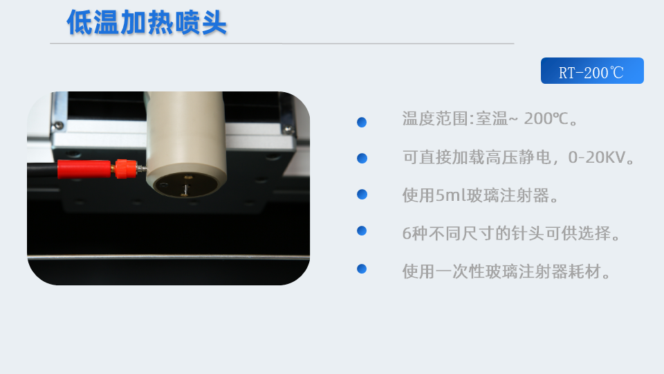 熔融直寫 | 生物材料專用加熱頭:室溫-130攝氏度。電加熱頭加熱的同時實現高壓隔離,高壓施加針頭上。使用常規5ml玻璃注射器。搭配6個不同尺寸的針頭。可使用廉價拋棄型玻璃耗材。 |